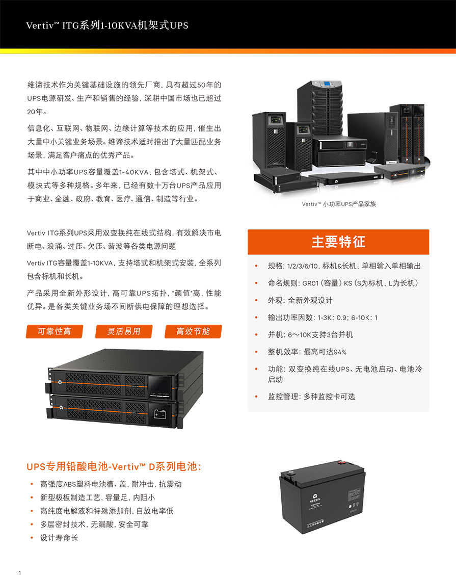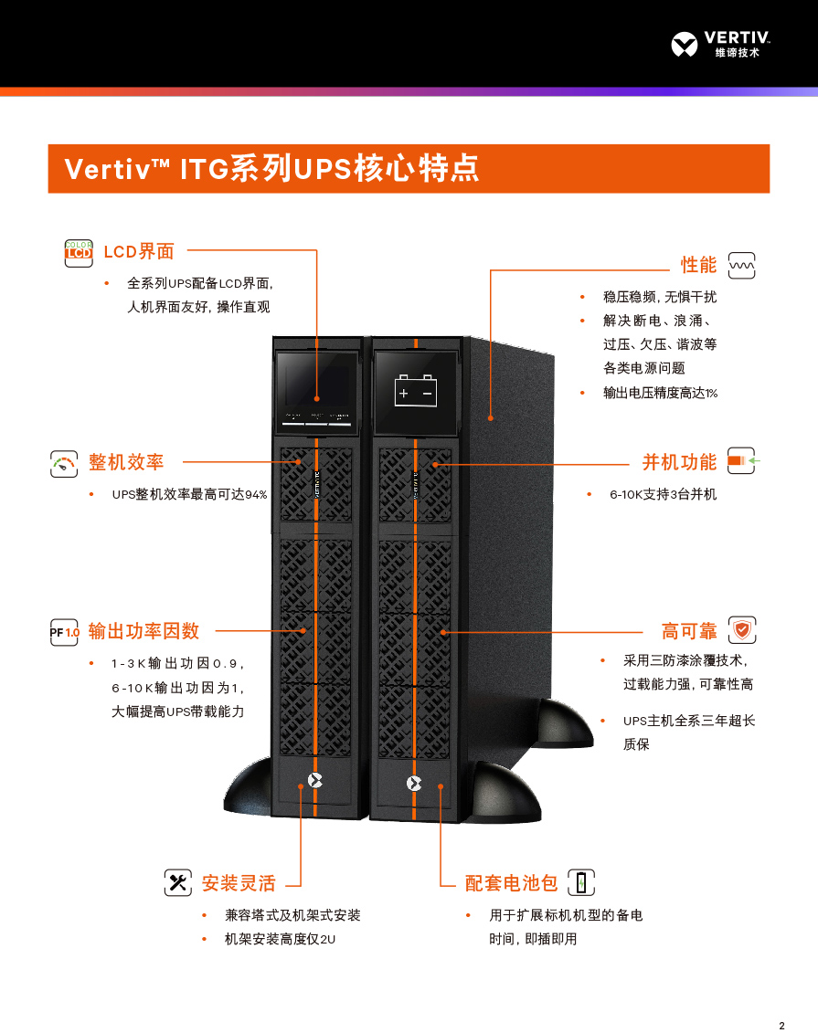 维谛技术作为关键基础设施的领先厂商,具有超过50年的UPS电源研发、生产和销售的经验,深耕中国市场也已超过20年。 信息化、互联网、物联网、边缘计算等技术的应用,催生出大量中小关键业务场景。维谛技术适时推出了大量匹配业务场景,满足客户痛点的优秀产品。其中中小功率UPS容量覆盖1-40KVA,包含塔式、机架式、模块式等多种规格。多年来,已经有数十万台UPS产品应用于商业、金融、政府、教育、医疗、通信、制造等行业。 Vertiv™ ITG系列UPS采用双变换纯在线式结构,有效解决市电断电、浪涌、过压、欠压、谐波等各类电源问题。产品容量覆